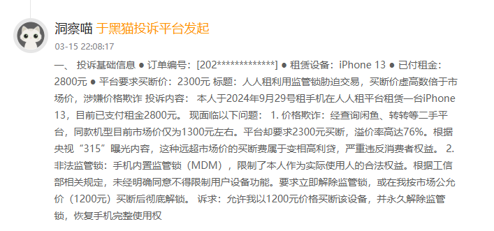 记者注意到,涉及人人租的主要投诉集中在:恶意扣费、“高利贷”式收费、暴力催收、远程锁机、售后难、商品质量问题等。其中,有网友投诉称,在人人租平台上租用iPhone 13,已付租金2800元,还被平台要求支付2300元买断费,总支出5100元远超同期新机价格,据该网友反馈,该机型在二手平台上的市场价仅为1300元,平台要求的“买断费”溢价率高达76%,因此该网友认为,这种远超市场价的买断费属于变相高利贷,严重违反消费者权益。