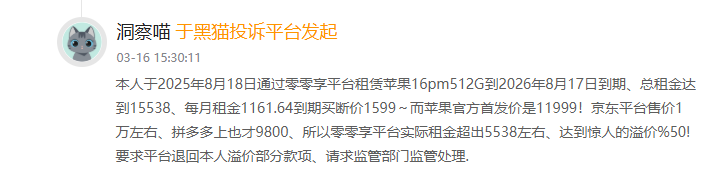 有网友投诉称,“本人于2025年8月18日通过零零享平台租赁苹果16pm512G到2026年8月17日到期、总租金达到15538、每月租金1161.64到期买断价1599~而苹果官方首发价是11999!京东平台售价1万左右、拼多多上也才9800、所以零零享平台实际租金超出5538左右、达到惊人的溢价50%!”