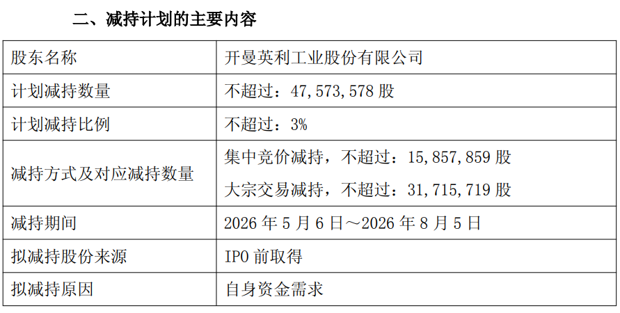 4月8日,英利汽车(601279)发布公告,控股股东开曼英利工业股份有限公司因自身资金需求,计划在2026年5月6日至2026年8月5日,通过集中竞价和大宗交易方式,减持不超过4757万股公司股份,占公司总股本的3%。