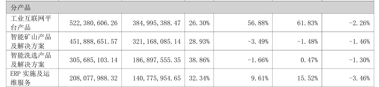 智能矿山产品及解决方案、智能洗选产品及解决方案两大传统优势业务同步走弱,收入分别下滑3.49%、1.66%,毛利率各降1.46个、1.30个百分点;就连收入同比增长9.61%的ERP实施及运维服务,毛利率也暴跌3.46个百分点,为降幅最大板块。