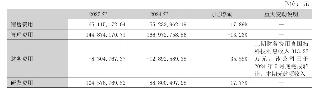 期间费用方面,公司销售费用为6511.52万元,同比增长17.89%;研发费用为1.05亿元,同比增长17.77%;财务费用为-830.48万元,同比增长35.58%,上期财务费用含国拓科技利息收入313.22万元,该公司已于2024年5月底完成转让,本期无此项收入;管理费用为1.45亿元,同比下降13.23%。