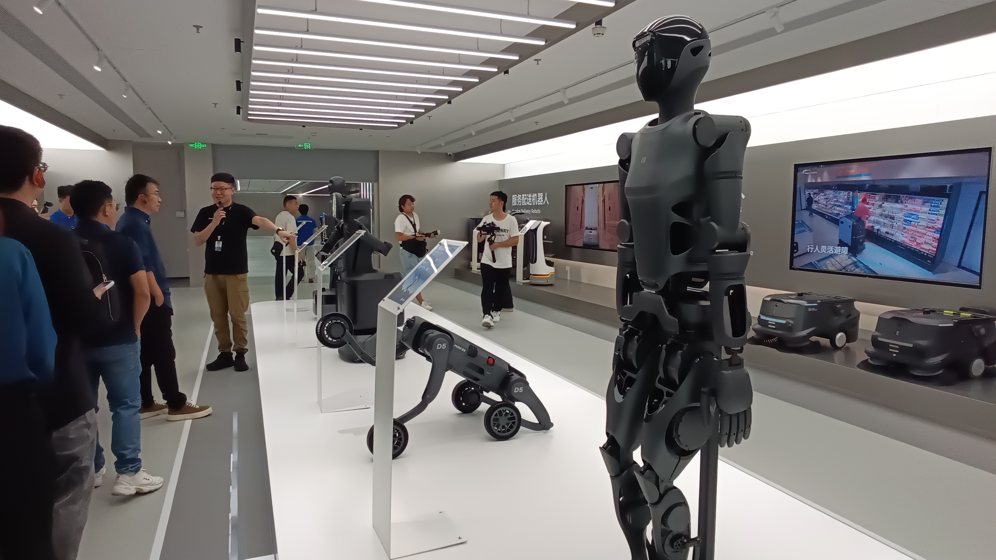 胸前有着三层托盘的“欢乐送”机器人会根据要求将不同菜品送到不同的餐桌前;AI全能清洁机器人除了会“吸食”各类地面垃圾,融合AI视觉识别后,能实时识别并清理咖啡、积水等湿污渍,它还懂得赶回工作站自动充电、自动加排水;类人形具身智能服务机器人“闪电匣”既有灵活的双手,也有高性能全向移动底盘,懂得自己按电梯、刷闸机;工业配送机器人能够驮着重约600公斤的货物,自动跟随主人前行……