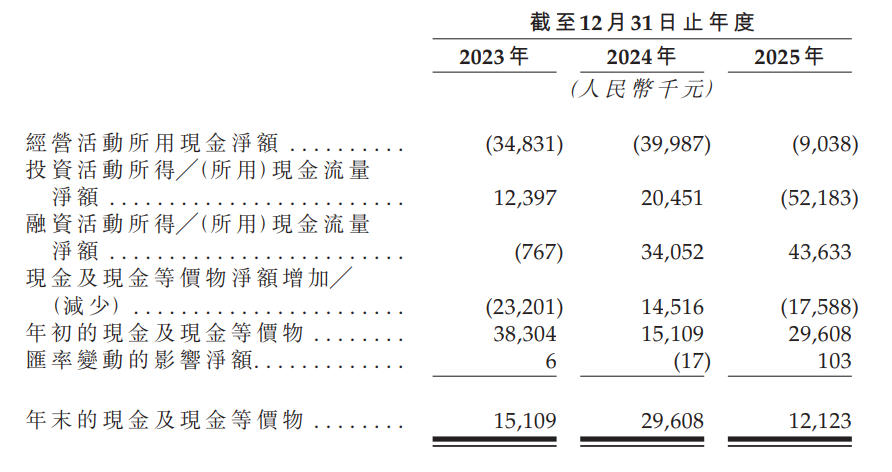 2023年~2025年,公司分别录得经营活动所用现金净额34.8百万元、40.0百万元及9.0百万元。