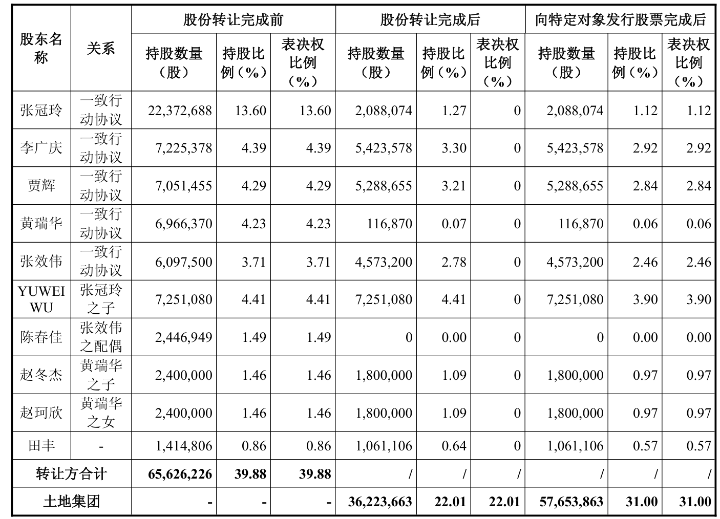 本次协议转让完成前,公司无控股股东,实际控制人为张冠玲、李广庆、贾辉、黄瑞华、张效伟,土地集团未持有公司股份。