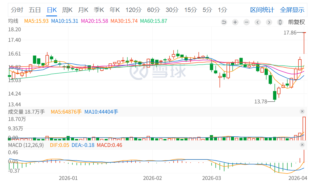 4月9日复牌,嘉华股份(603182)开盘即冲涨停,随后短暂开板回落,资金博弈后迅速回封,截至午间收盘报17.86元/股。消息面上,公司控股股东将变更为山东省土地发展集团有限公司(下称 “土地集团”),国资背书提振市场信心。值得注意的是,4月1日停牌,公司股价已连续三个交易日上涨。