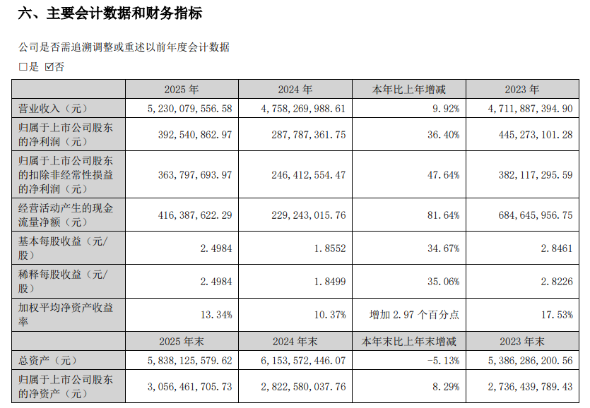 根据年报披露,小熊电器2025年实现营业收入5,230,079,556.58元,同比增长9.92%;归属于上市公司股东的净利润392,540,862.97元,同比增长36.40%。扣非净利润3.64亿元,同比大增47.64%。