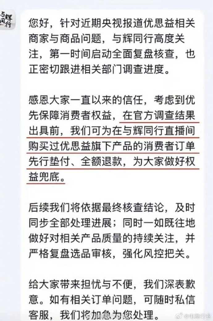 面对大量消费者售后诉求,各直播间纷纷给出各自补偿方案。例如,2026年4月2日,“与辉同行”通过客服及部分渠道回应,表示已启动全面复盘核查,并承诺在官方调查结论出具前,为在其直播间购买过相关产品的消费者订单先行垫付、全额退款。