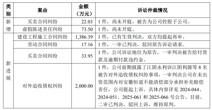 至于本次公告的诉讼、仲裁对公司本期利润或期后利润的可能影响,公告表示,目前,部分案件尚未开庭审理,部分案件已有生效判决双方均提起再审,诉讼结果存在不确定性。公司将依据会计准则的要求和案件进展情况进行相应的会计处理,并密切关注上述案件进展,依法主张并积极采取相关法律措施维护公司和全体股东合法利益。公司将根据诉讼的进展情况按照监管要求及时履行信息披露义务。请广大投资者谨慎决策,注意风险。