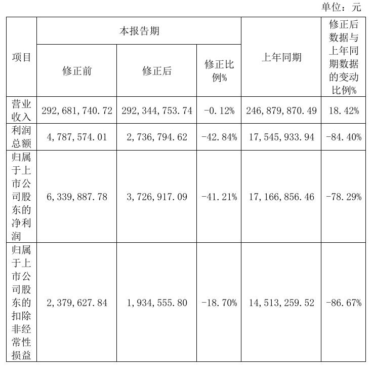 修正原因主要是财务人员将政府部门支持企业发展的款项错误核算,需按照相关会计准则进行调整。此外,公告还提到其他小额调整如股份支付费用引起的所得税费用等。总资产和归母权益的修正数据分别为4.78亿元和3.51亿元,变动比例为-0.52%和-0.85%。