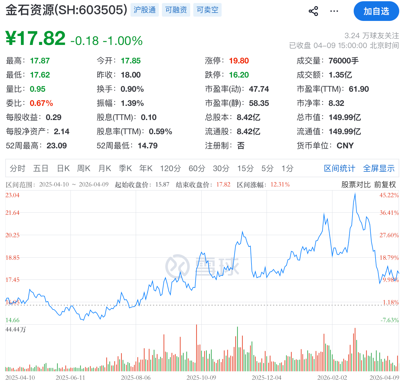 二级市场上,截至4月9日收盘,金石资源下跌1.00%报17.82元/股,总市值约149.99亿元。