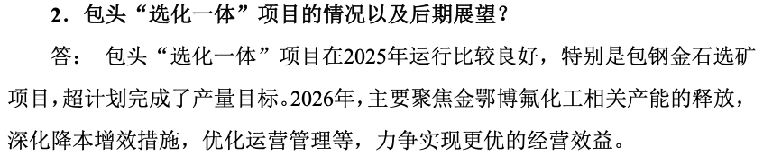 在此前调研活动中,金石资源曾表示,包头“选化一体”项目在2025年运行比较良好,特别是包钢金石选矿项目,超计划完成了产量目标。2026年,主要聚焦金鄂博氟化工相关产能的释放,深化降本增效措施,优化运营管理等,力争实现更优的经营效益。