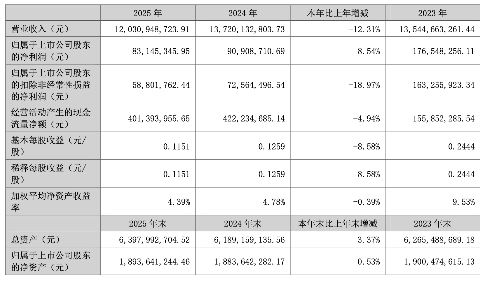 4月9日,太阳电缆(002300)公布2025年年报,公司合并报表实现营业总收入120.31亿元,同比下降12.31%;实现利润总额1.12亿元,同比下降1.52%;实现净利润6064.20万元,同比下降19.15%,其中归属于上市公司股东的净利润8314.53万元,较上年同期9090.87万元,减少776.34万元,下降8.54%。