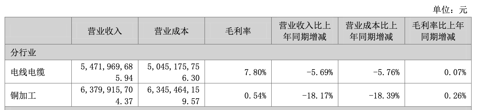 年报显示,分行业看,电线电缆业务收入54.72亿元,同比下降5.69%,毛利率微增0.07%至7.8%;铜加工业务作为公司营收“半壁江山”,收入63.8亿元,同比下滑18.17%,毛利率仅0.54%。
