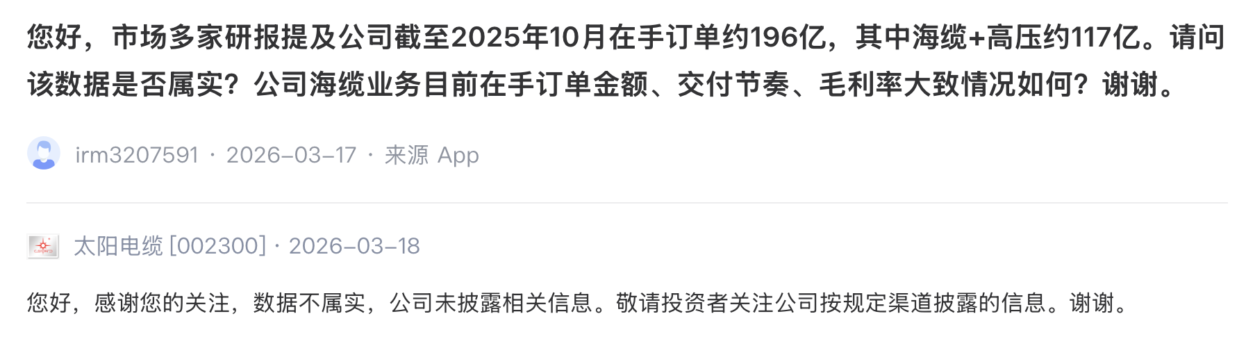 此前,有传闻称“市场多家研报提及该公司截至2025年10月在手订单约196亿,其中海缆+高压约117亿”,投资者在深交所互动易平台向太阳电缆求证,太阳电缆对此回复称:“数据不属实,公司未披露相关信息”。