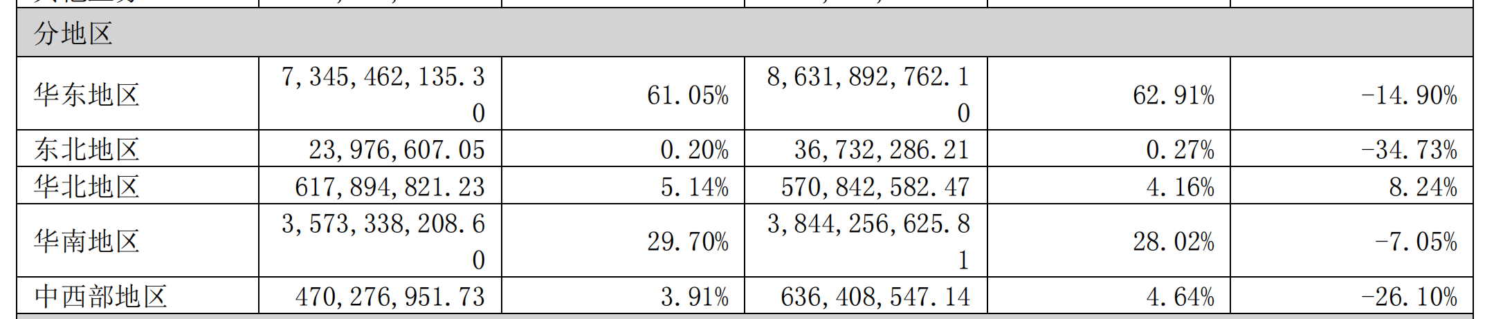 分地区来看,华东地区收入73.45亿元,同比下降14.90%;华南地区收入35.73亿元,下滑7.05%;中西部地区收入4.70亿元,下滑26.10%。唯有华北地区逆势增长8.24%,但体量仅6.18亿元,难以扭转全局。