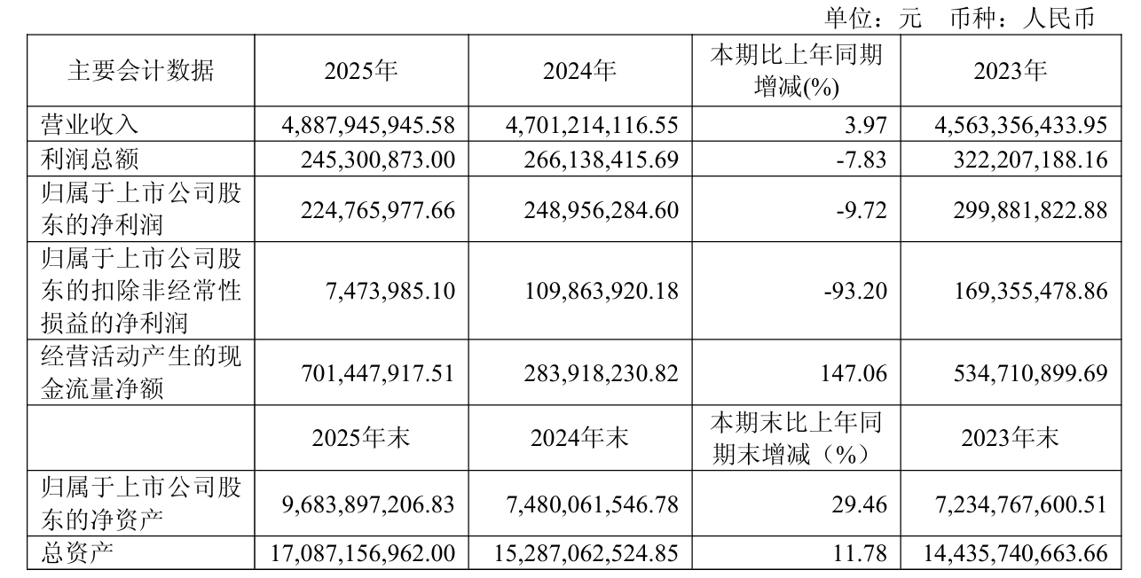 4月9日晚间,湘电股份(600416)发布2025年年度报告,公司全年实现营业收入48.88亿元,同比上升3.97%;归母净利润同比下降9.72%至2.25亿元,连续两年下滑;扣非净利润仅剩747.4万元,同比大降93.2%。