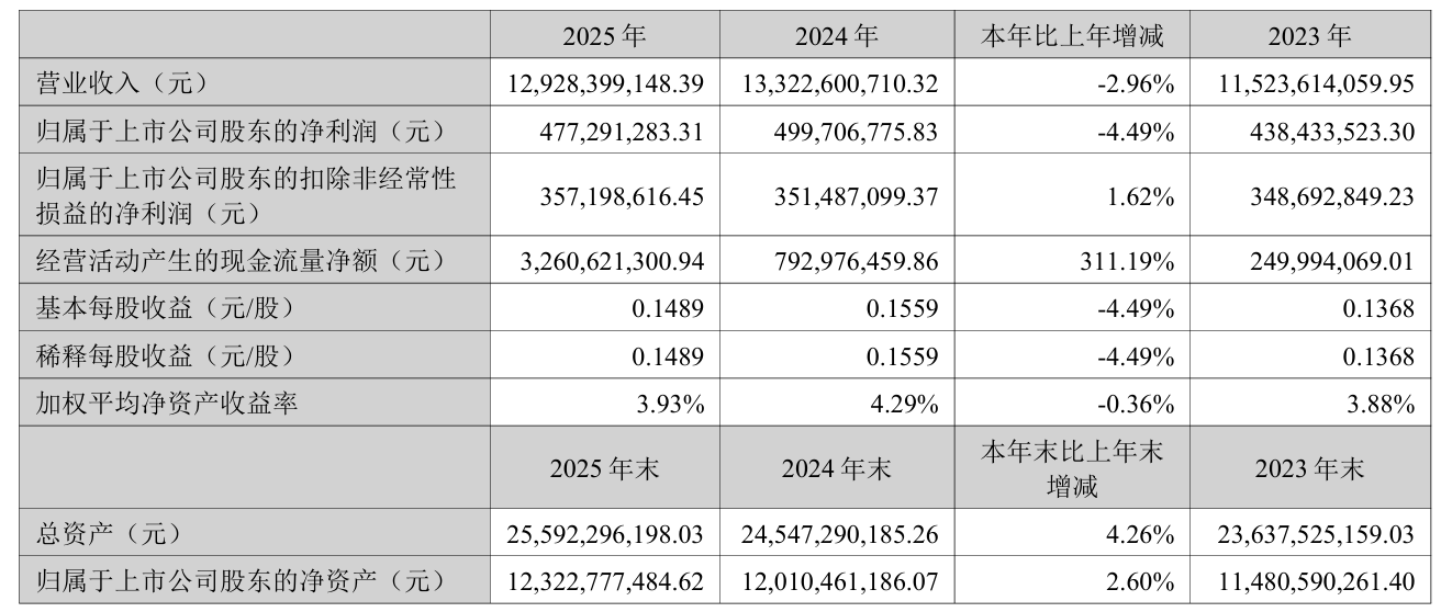 4月9日晚间,东华软件(002065)发布2025年年度报告,公司全年实现营业收入129.28亿元,同比减少2.96%;归母净利润为4.77亿元,同比减少4.49%;扣非净利润为3.57亿元,同比增加1.62%。