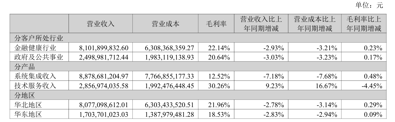 分产品来看,公司两大业务走势分化:系统集成业务作为营收支柱占比高达68.68%,收入同比下滑7.18%,毛利率却逆势微增0.48个百分点;技术服务业务占比22.10%,收入同比增长9.23%,但毛利率同比“跳水”4.45个百分点。