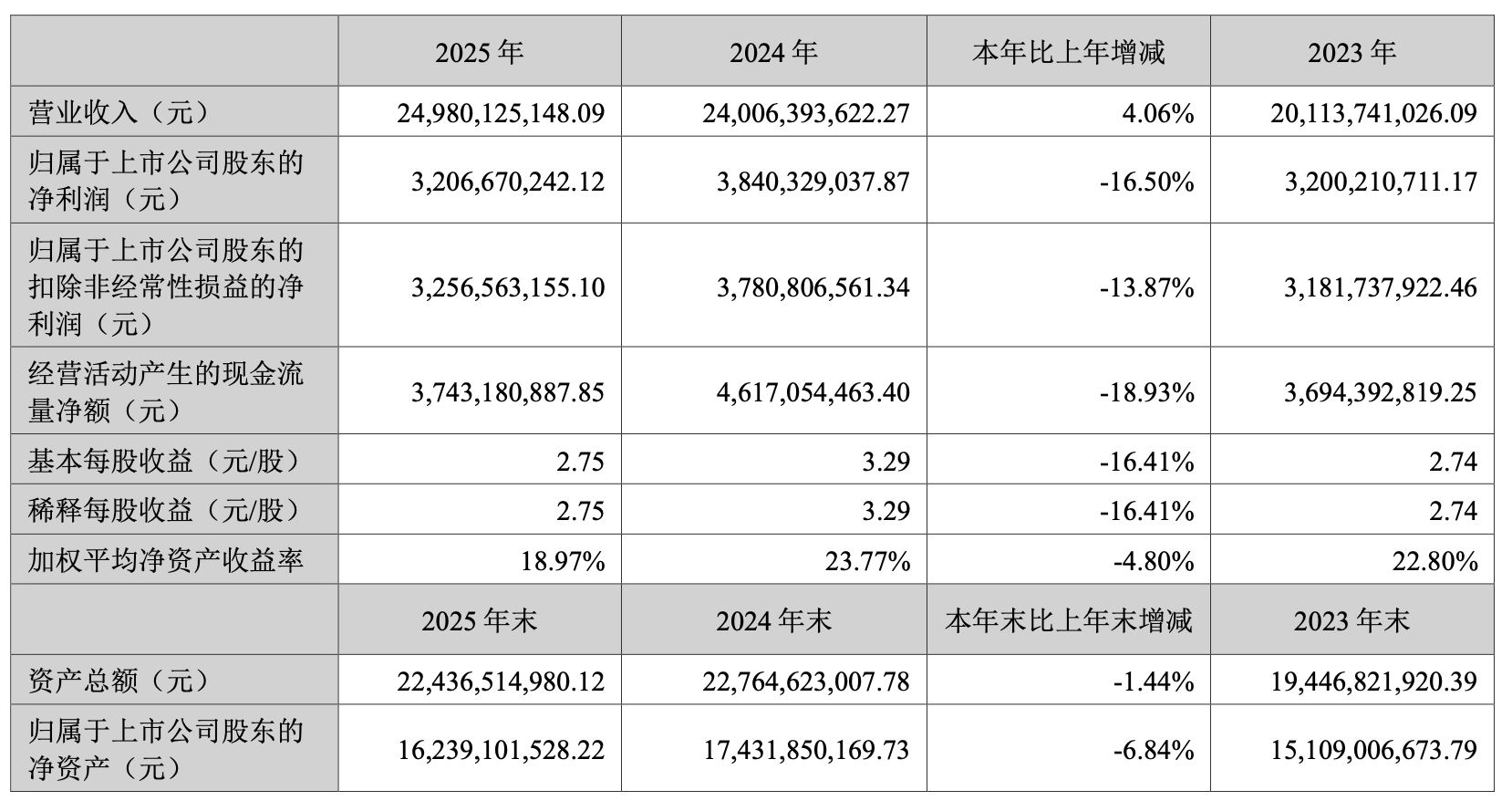 4月9日,华利集团(300979)披露年报,2025年实现营业收入249.8亿元,同比增长4.06%;归母净利润32.07亿元,同比下降16.5%;基本每股收益2.75元。公司拟每10股派发现金红利11元(含税)。