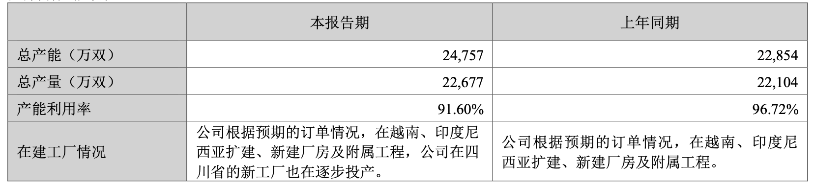 2025年,公司位于中国、越南及印度尼西亚的新工厂产量总计约1452万双,新工厂整体爬坡进度符合公司预设规划。由于较多新工厂处于爬坡阶段以及产能调配安排,公司整体毛利率同比上年有所下滑。