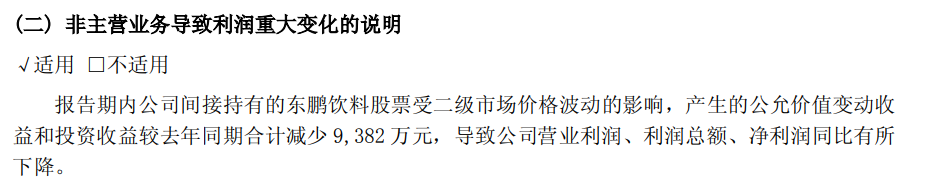 对于公司营收增长、净利不佳的原因,在年报中,巴比食品作了非主营业务导致利润重大变化的说明:报告期内公司间接持有的东鹏饮料股票受二级市场价格波动的影响,产生的公允价值变动收益和投资收益较上年同期合计减少9,382万元,导致公司营业利润、利润总额、净利润同比有所下降。