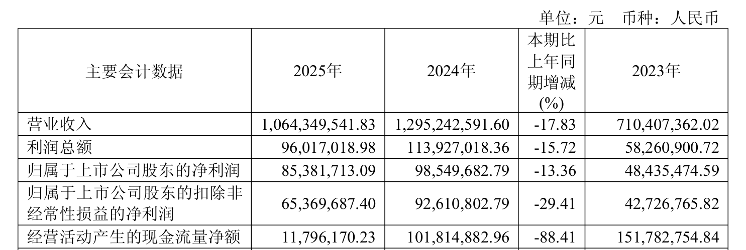4月10日晚间,越剑智能(603095)发布2025年年报,报告期内实现营业收入约10.64亿元,同比减少17.83%;归属于上市公司股东的净利润约8538.17万元,同比减少13.36%。
