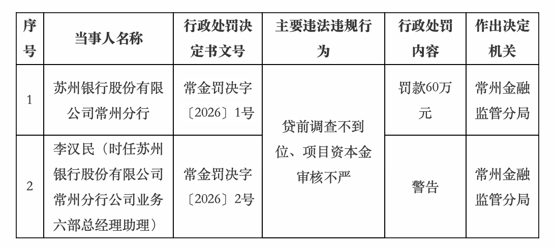 因贷前调查不到位、项目资本金审核不严,苏州银行股份有限公司常州分行被罚款60万元,时任苏州银行股份有限公司常州分行公司业务六部总经理助理李汉民被警告。