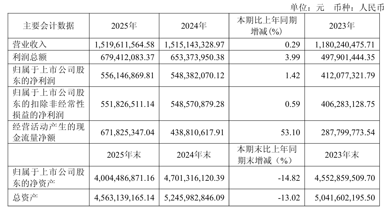 截至2025年末,公司总资产45.63亿元,净资产41.43亿元,归属于上市公司股东的净资产40.04亿元,负债总额4.20亿元,资产负债率为9.20%。