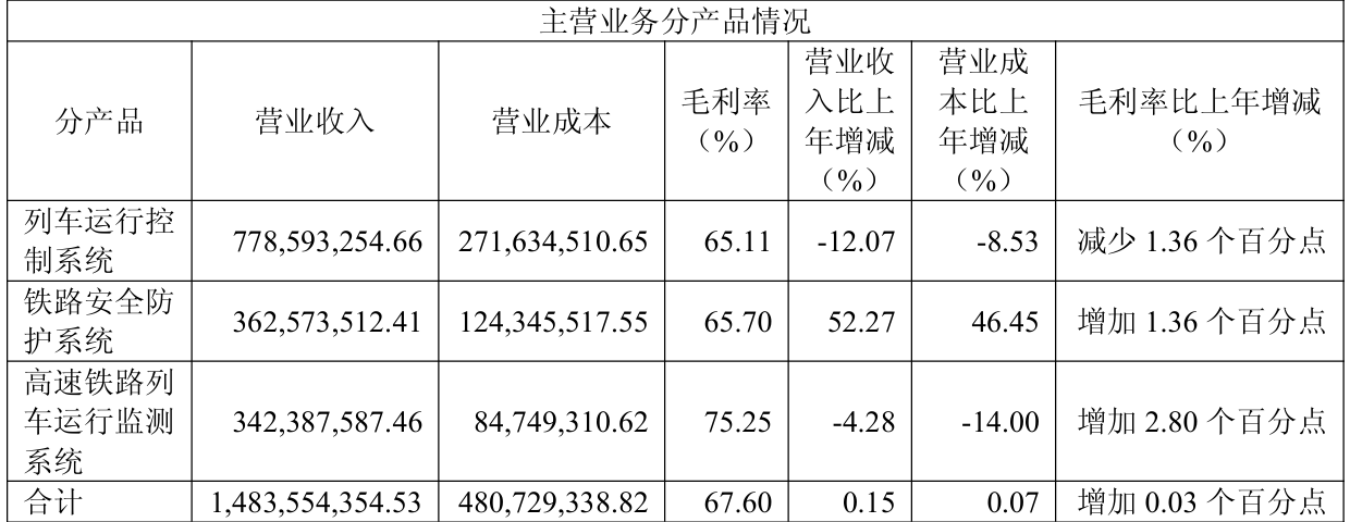 其中,列控系统实现营业收入7.79亿元,占比52.48%;铁路安防业务实现营业收入3.63亿元,占比24.44%;高铁运行监测业务实现营业收入3.42亿元,占比23.08%。