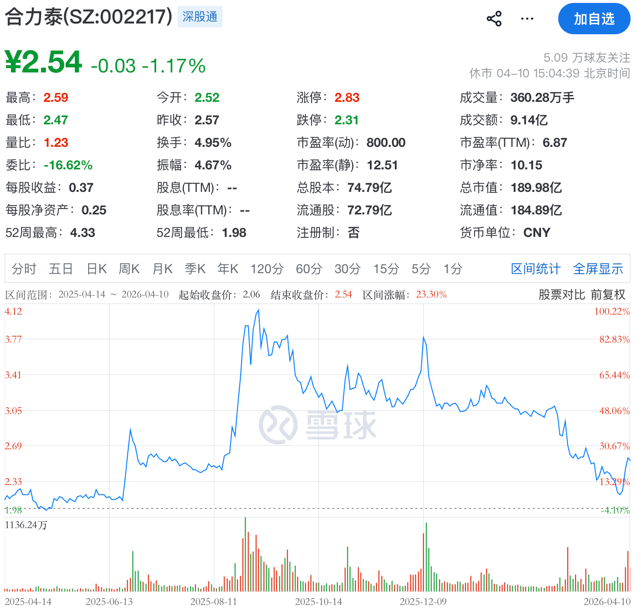 二级市场上,截至4月10日收盘,合力泰下跌1.17%报2.54元/股,总市值约189.98亿元。