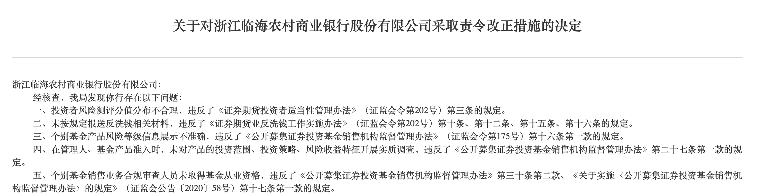 浙江证监局强调,浙江临海农商银行应高度重视,严格对照基金销售相关法律法规,采取有效措施落实整改,切实加强基金销售业务管理,并于收到决定书之日起30日内向该局提交书面整改报告,该局将视情况进行检查验收。