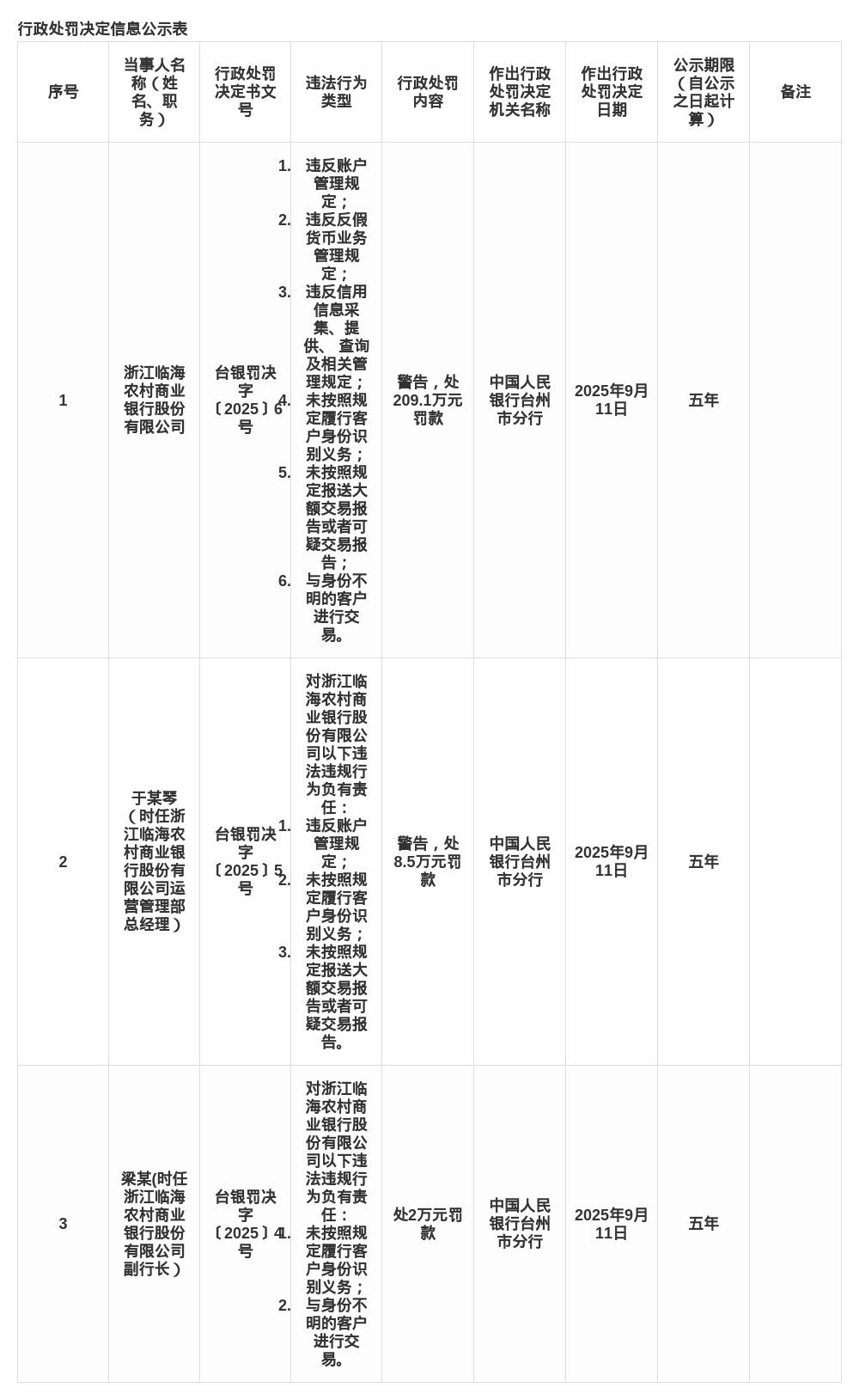 2025年9月19日,中国人民银行台州市分行行政处罚决定信息公示表显示,浙江临海农商行因“违反账户管理规定;违反反假货币业务管理规定;违反信用信息采集、提供、查询及相关管理规定;未按照规定履行客户身份识别义务;未按照规定报送大额交易报告或者可疑交易报告;与身份不明的客户进行交易”等行为,被警告并罚款209.1万元。