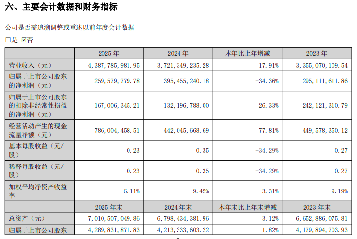 2025年年报显示,公司全年实现营业收入43.88亿元,同比增长17.91%;归母净利润2.6亿元,同比减少34.36%;扣非归母净利润1.67亿元,同比增长26.33%;基本每股收益0.23元,同比减少34.29%。其中,2025年第四季度营业收入10.88亿元,同比增长12.12%;归属于母公司所有者的净亏损3572.09万元,上年同期净利润1363.63万元,由盈转亏。
