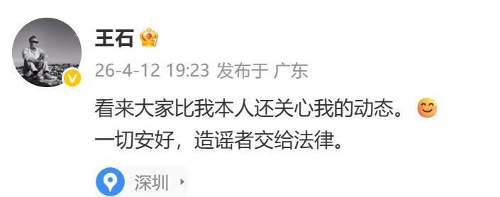 针对此传闻, 4月12日晚上7时许,王石发文亲自辟谣:“看来大家比我本人还关心我的动态。一切安好,造谣者交给法律。”