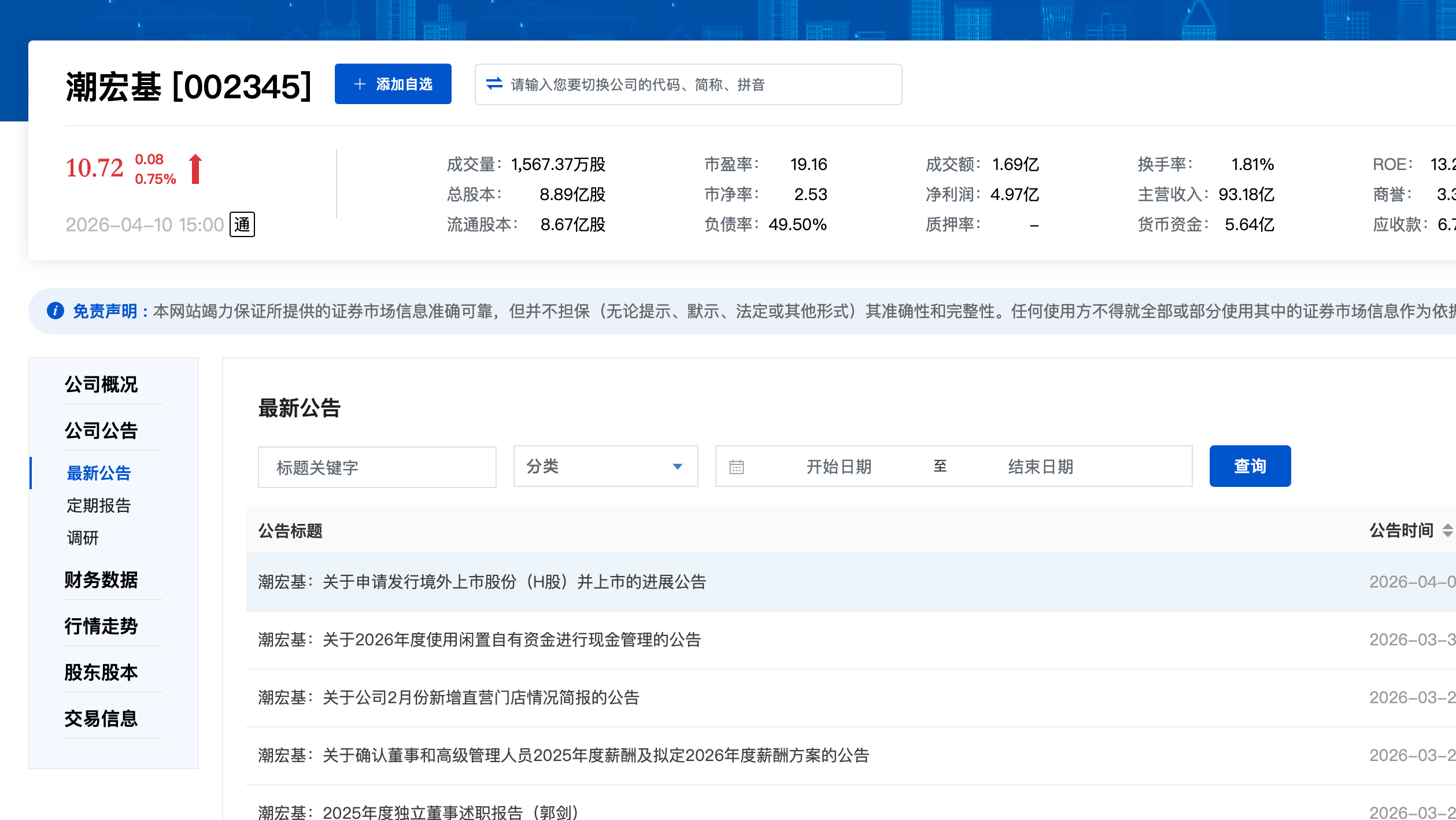 截至2026年4月12日股市收盘,潮宏基(002345.SZ)实时股价报10.72元,4月10日开盘价为10.72元,成交额达1.69亿元,总市值达95.25亿元。