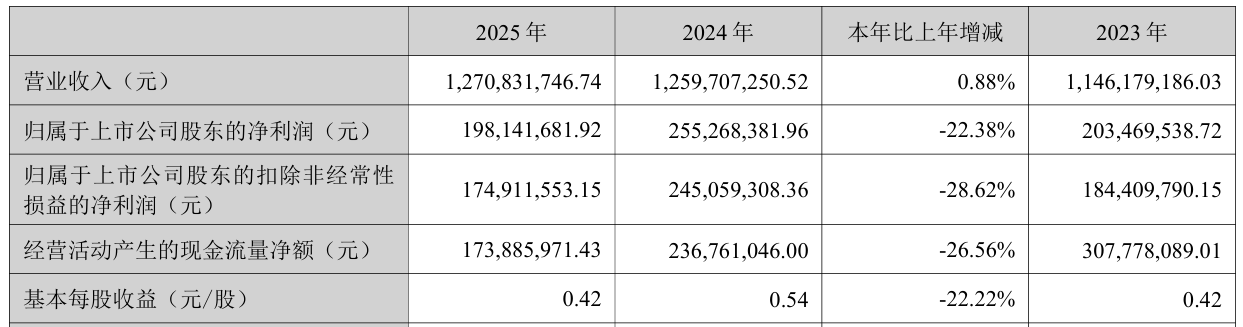4月10日,佳士科技(300193)发布2025年年报。数据显示,公司2025年实现营业收入12.71亿元,同比增长0.88%;归母净利润1.98亿元,同比下降22.38%;扣非净利润1.75亿元,同比下降28.62%。