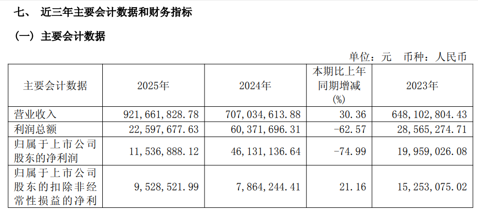 德宏股份在年报中称,2025年是公司转型升级的攻坚之年。面对汽车行业新能源化和智能化转型加速深化、行业内卷竞争越趋激烈、有色金属价格高位震荡上行等复杂多变的外部环境,公司深入落实发展战略,全年各业务板块营业收入由点到面,全面增长。主要产品发电机实现销售172.12万台,同比增长17.07%,销量创公司历史新高,市场地位更加突出。电子真空泵实现销售57.90万台,同比增长35.31%,深耕市场持续放量。锂电产品种类增多,工商业储能电站批量并网,储能业务发展初具规模。在困境中实现了业务规模显著提升、主营利润同比增长,为公司高质量发展与壮大奠定了坚实基础。2025年公司各项经济指标同比及完成情况如下:全年实现营业收入9.22亿元,较2024年增长30.36%,再创历史新高;实现归属于母公司股东的净利润1,153.69万元,较去年下降74.99%;实现归属于母公司股东扣除非经常性损益后的净利润952.85万元,同比去年增长21.16%。