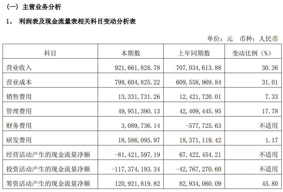 年报显示,报告期公司营业收入同比增长30.36%,但营业成本增幅达31.01%,营业成本增速高于营收增速,部分挤压了利润空间。