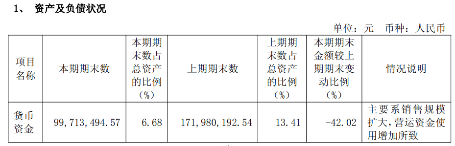 现金流方面,公司报告期末货币资金余额为9971万元,较上期期末下降42.02%,主要系销售规模扩大,营运资金使用增加所致;公司报告期末经营现金流净额为-8142万元,同比由正转负,主要系销售规模扩大,应收账款增加所致。