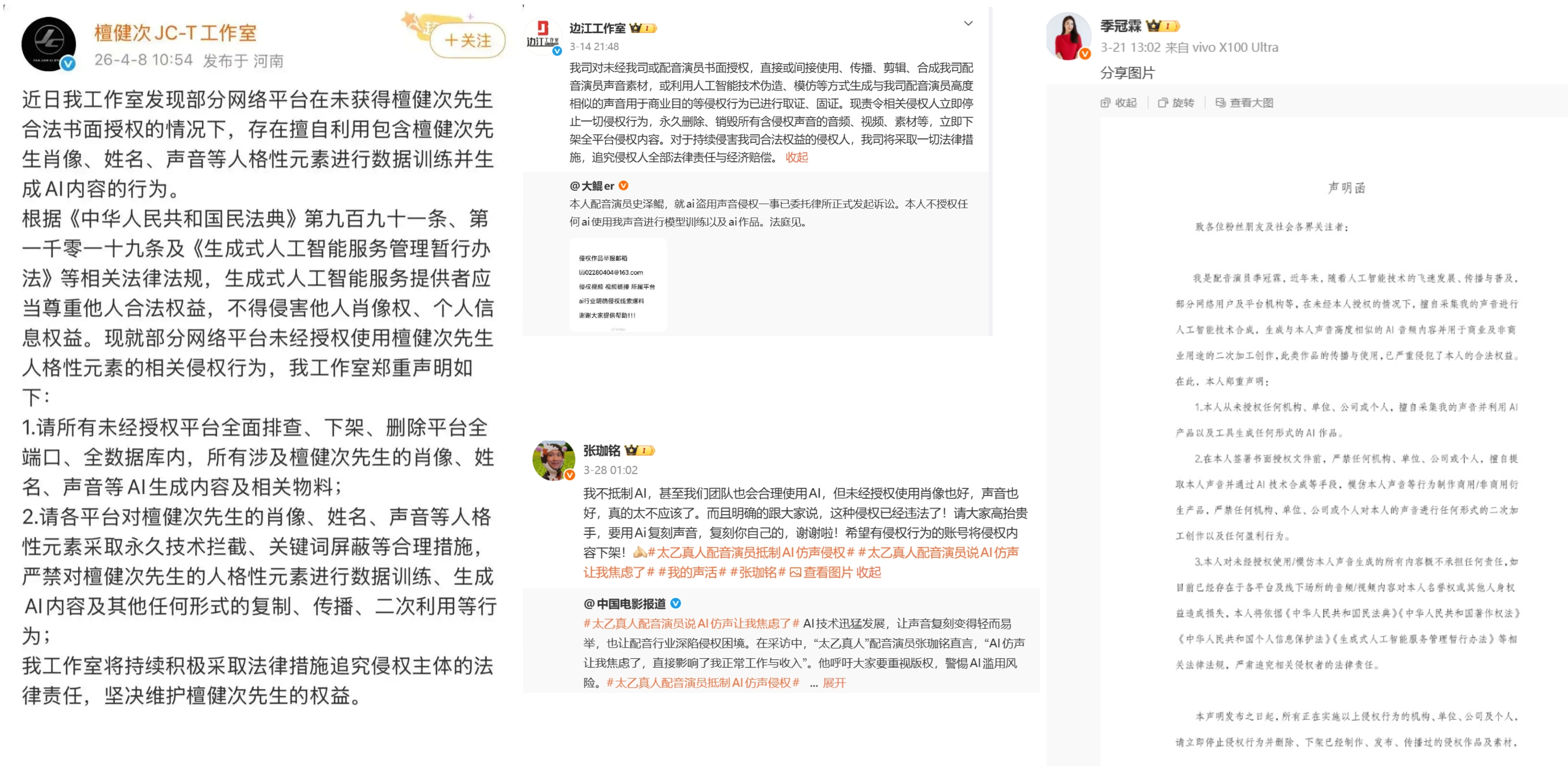 AI换脸乱象未平,AI盗声又成新隐患——克隆声音相似度可达90%以上!叶清、季冠霖等配音演员3月集体维权,演员檀健次工作室也于近日发声明抵制未经授权的AI声音、肖像生成内容。当AI偷走我们的声音,侵权如何认定?普通人该如何维权?记者采访法律专业人士获悉,我国法律明确保护自然人声音权益,未经许可用AI克隆、使用他人声音均属侵权,全链条固证、追责可有效守护数字人格权。