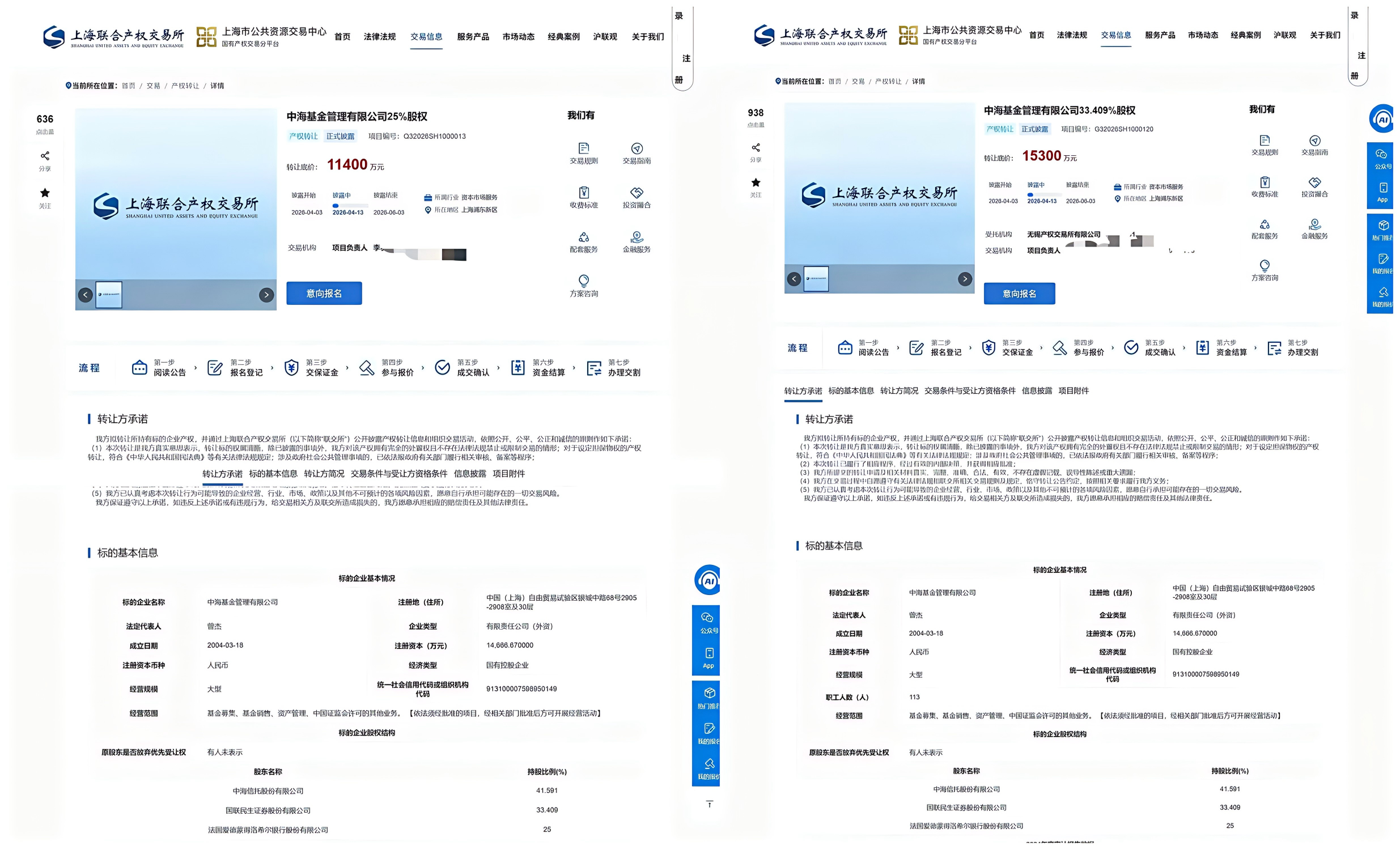 稍早之前,中海基金的股权也被挂牌转让。根据上海联合产权交易所公布的信息,中海基金第二大股东国联民生证券(原国联证券)与第三大股东法国爱德蒙得洛希尔银行联合挂牌转让股权,转让比例分别为 33.409% 和 25%,转让底价分别为 1.53 亿元、1.14 亿元,合计底价为2.67 亿元。本次交易有一条硬性“捆绑”规定:此次转让采用联合转让方式,受让方须同时受让上述两笔股权——也就是说,本次交易的买家将成为中海基金新的控股股东。而目前公司的第一大股东中海信托股份有限公司(持股41.591%)尚未明确是否放弃优先购买权。
