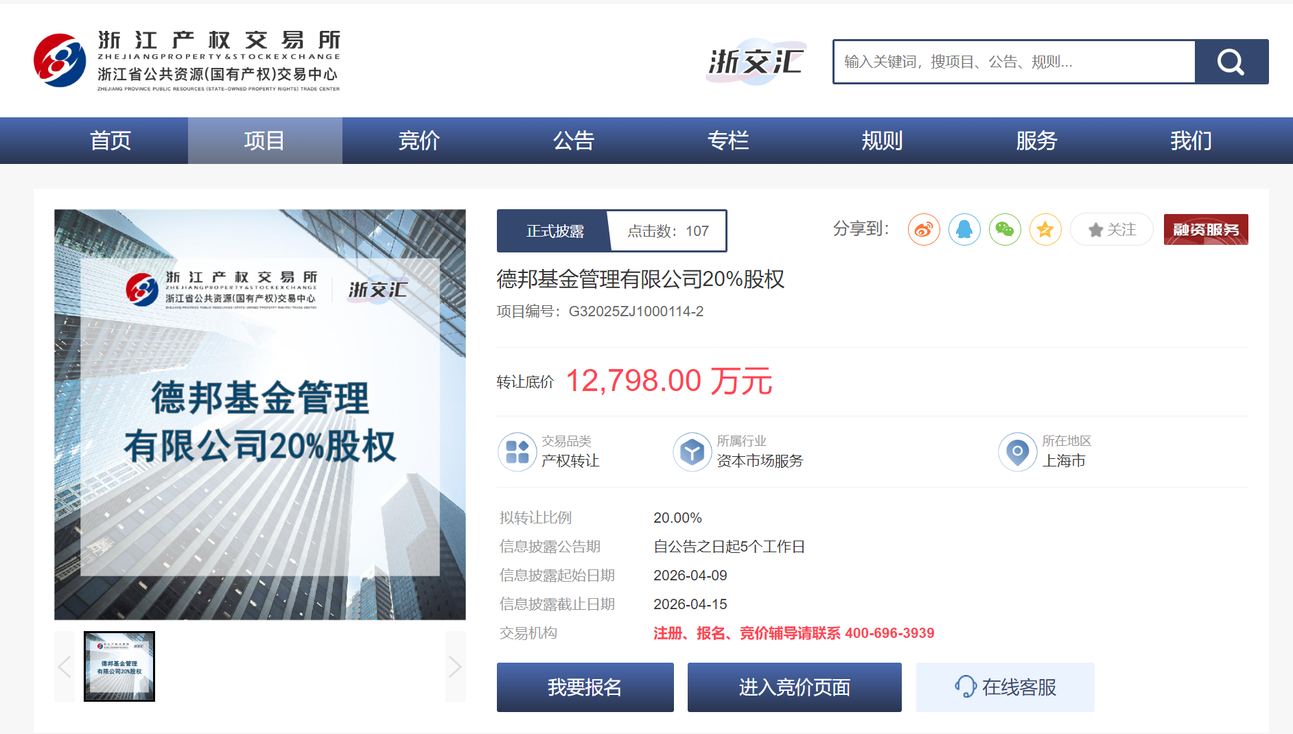根据浙江产权交易所官网信息,浙江省土产畜产进出口集团有限公司(即浙江土畜集团)拟将其持有的德邦基金20%股权公开挂牌转让,转让底价为1.28亿元,信息公示期为4月9日至4月15日。以上股权曾于2025年6月底挂牌,彼时挂牌底价为1.42亿元,最终流拍;本次价格较上次折价近10%。公开信息显示,浙江土畜集团是浙江省国际贸易集团有限公司旗下的商贸板块核心企业,主营业务涉及农副产品、纺织服装、轻工品等商品的进出口领域,此次转让意在“盘活存量资产、集中精力发展主业”。