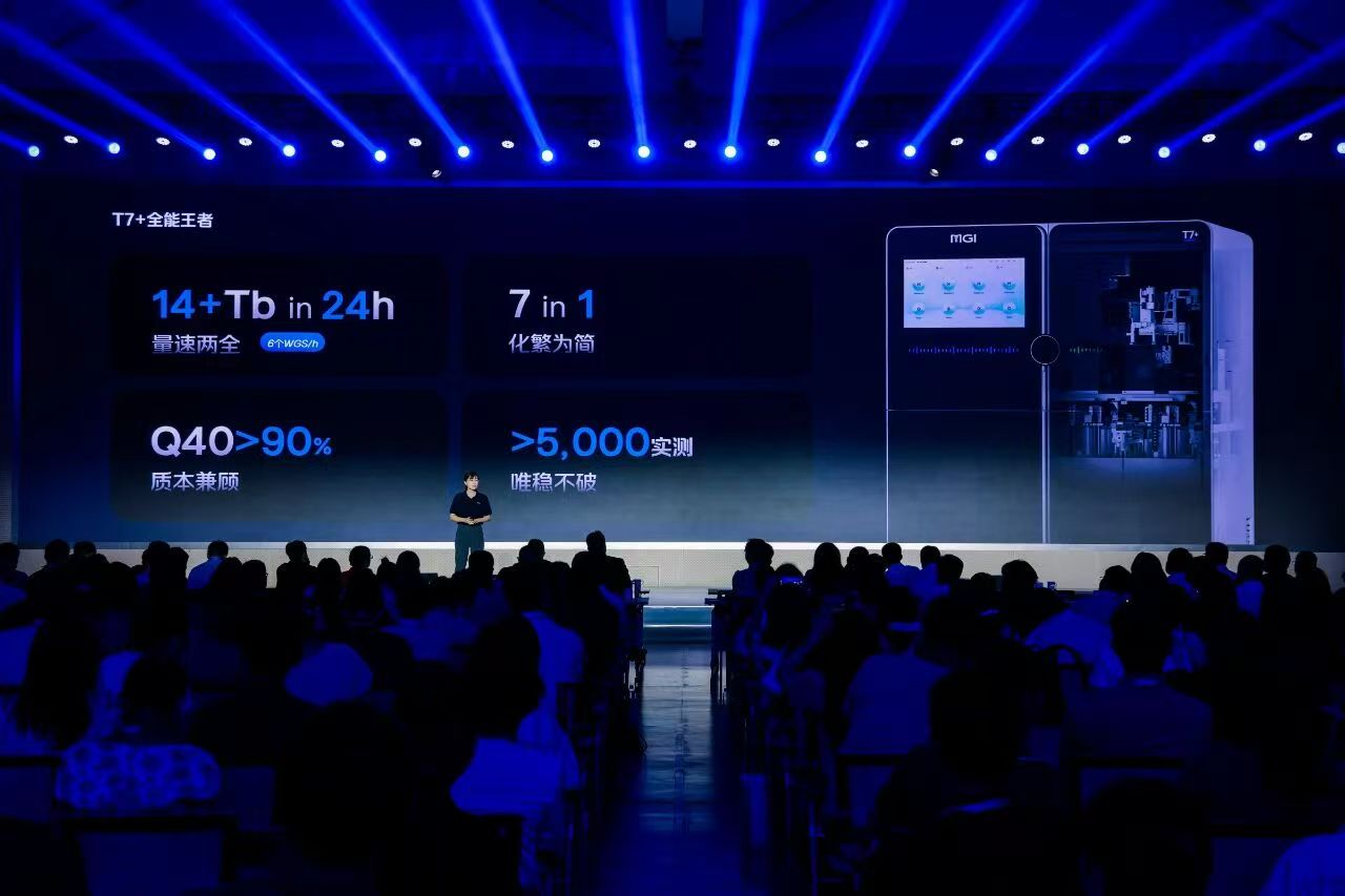 真正的转折点出现在2018年。那年,高通量测序仪T7正式发布。作为号称“全球日生产能力最强”的基因测序仪,T7自发布就拥有多个“光环”:“首个4联芯片的测序平台”“满负荷PE150不超过24小时”“日产数据量高达6T”“1天最多可完成60例个人全基因组测序”等等,堪称“超级生命计算机”。