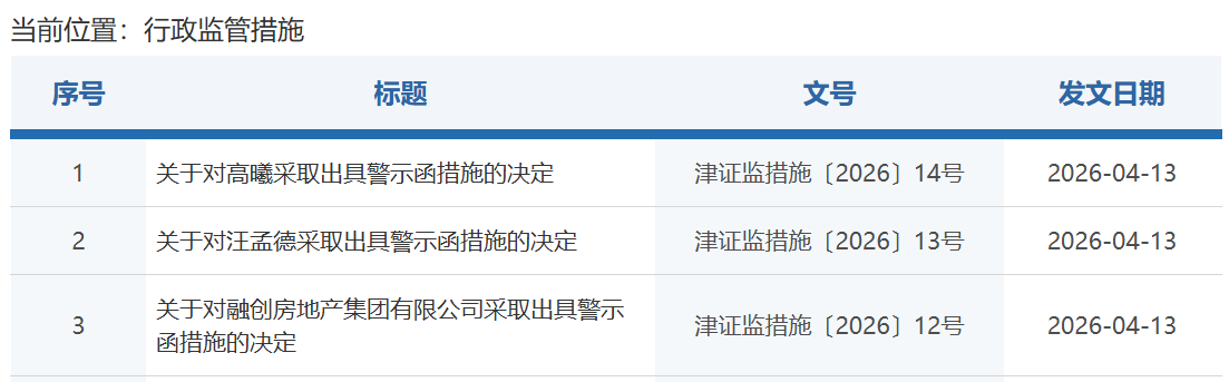 据天津证监局官网,4月13日,天津证监局发布对融创房地产集团有限公司以及相关责任人汪孟德、高曦采取出具警示函措施的决定。
