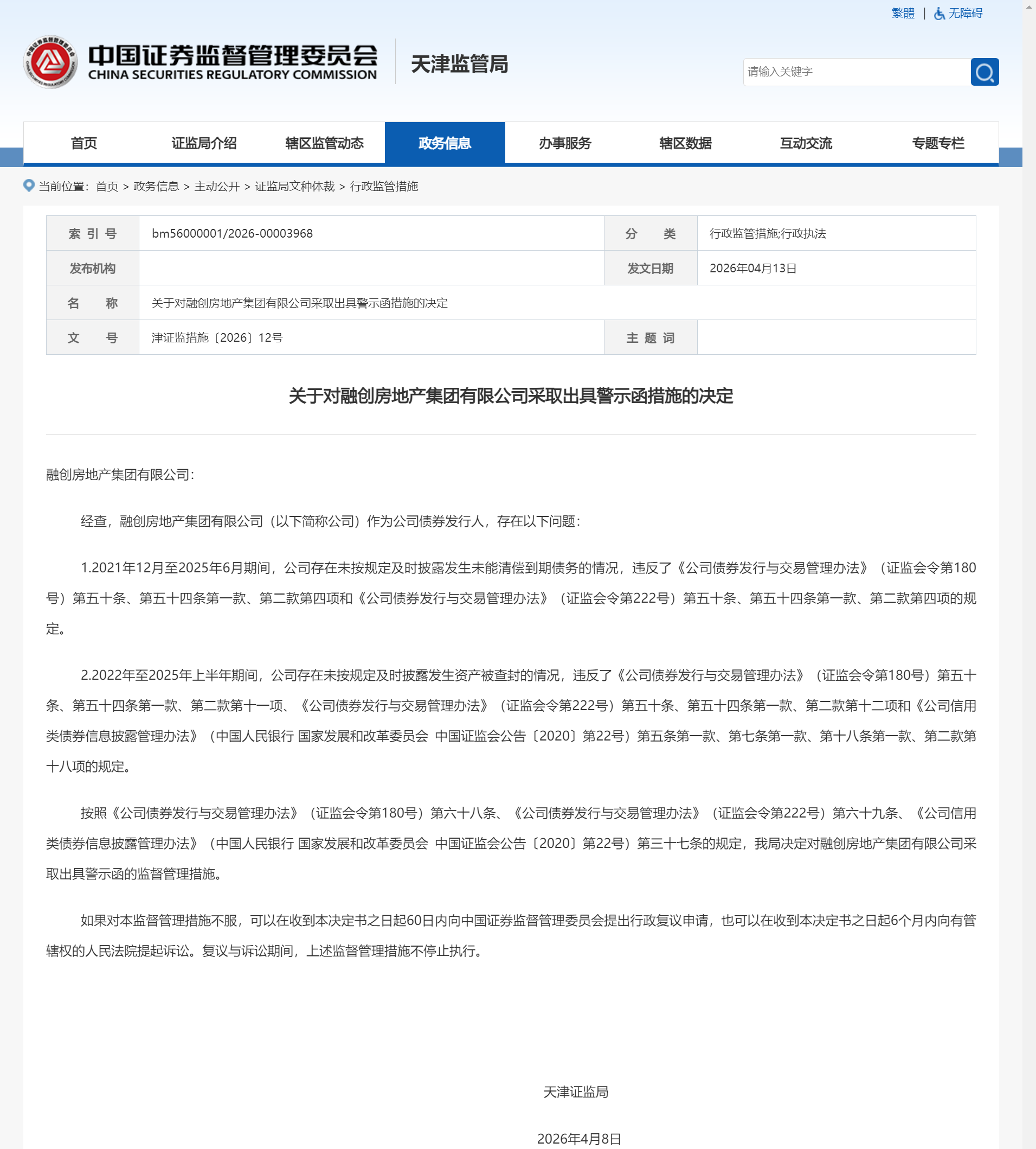 按照《公司债券发行与交易管理办法》第六十八条、《公司债券发行与交易管理办法》第六十九条、《公司信用类债券信息披露管理办法》第三十七条的规定,天津证监局决定对融创房地产集团有限公司采取出具警示函的监督管理措施。
