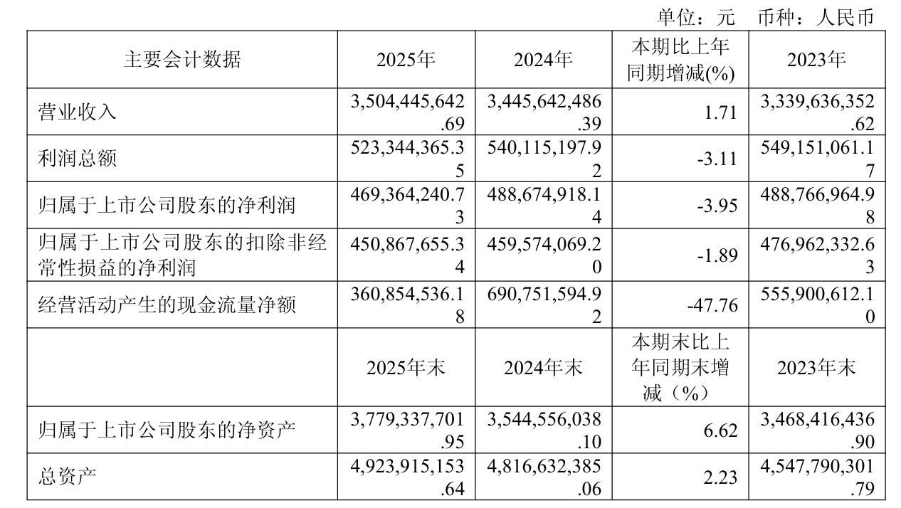 4月13日晚间,福元医药(601089)发布2025年年度报告,公司全年实现营业收入35.04亿元,同比上升1.71%;归母净利润为4.69亿元,同比下降3.95%,已连续第二年下滑;扣非归母净利润为4.51亿元,同比下降1.89%。
