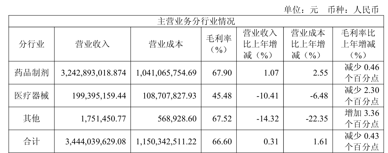 从收入结构来看,药品制剂业务撑起了公司超九成的营收江山。然而这根“顶梁柱”略显疲态,收入同比仅微增1.07%,毛利率却下滑0.46个百分点。