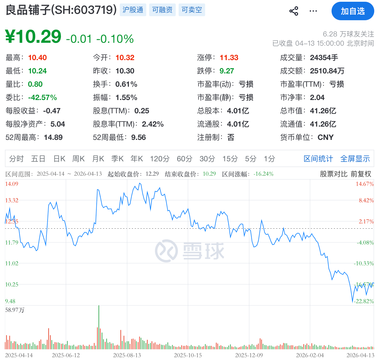 二级市场上,截至4月13日收盘,良品铺子下跌0.10%报10.29元/股,总市值约41.26亿元。
