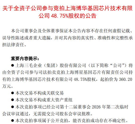 4月14日盘后,上海三毛(600689)公告称,公司将由全资子公司上海三毛资产管理有限公司参与司法拍卖竞拍上海博星基因芯片有限责任公司持有的上海博华基因芯片技术有限公司48.75%股权,起拍价为360.20万元。