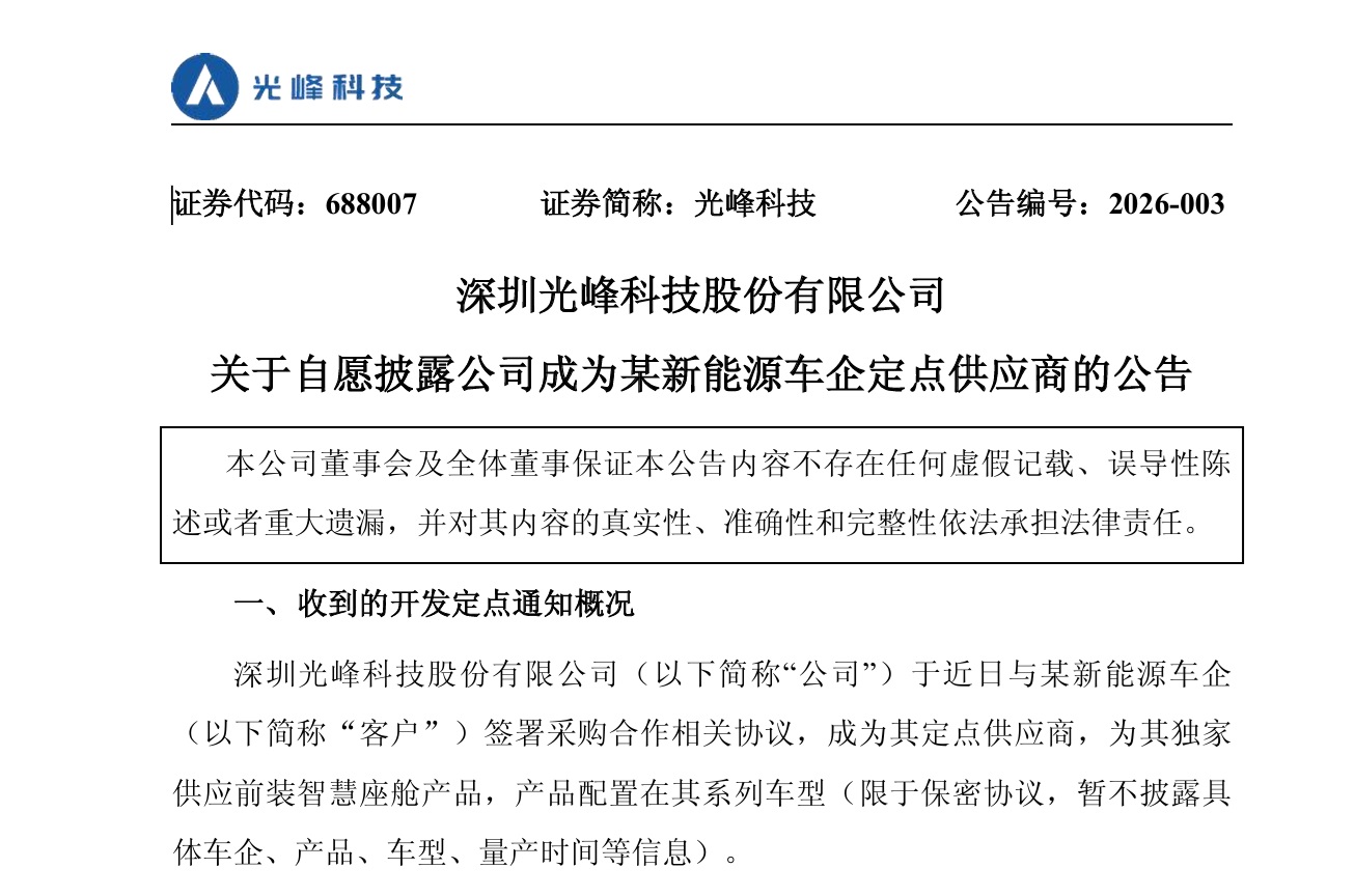 4月14日,光峰科技(688007.SH)发布公告称,与某新能源车企签署采购合作相关协议,成为其定点供应商,为其独家供应前装智慧座舱产品。